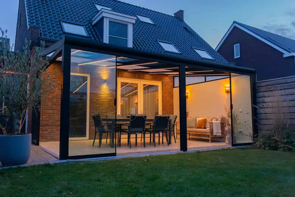 - Privacy and Cosiness (Winter/Evening): On dark winter evenings, vertical screens or blinds can transform the transparent space into an intimate, private room, insulating against the cold and creating a cosy atmosphere.